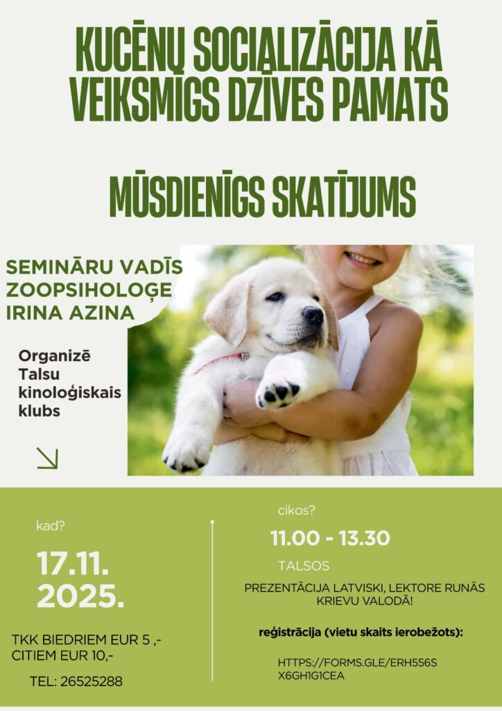 Talsu kinoloģiskais klubs izmanto lielisku iespēju un piedāvā ikvienam interesentam izglītojošu semināru “Kucēnu socializācija kā veiksmīgas dzīves pamats. Mūsdienīgs skatījums”